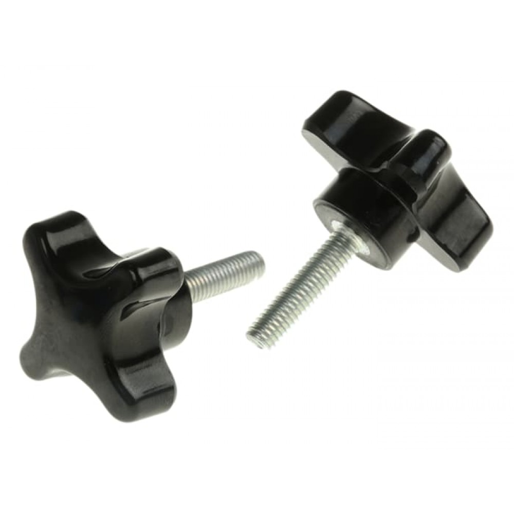 These star shaped handwheels – also known as multiple lobed handwheels– provide an easy-to-grip shape. This variation features four lobes, but other models will have varying numbers depending on the grip and pressure required. The knobs are fitted with a protruding screw insert (male) made from a combination of wood-filled impact-resistant thermoplastic bodies and zinc-plated steel inserts. Zinc-plated steel provides wear resistance for the threads to ensure that the threads last throughout general use and are not easily damaged or sheared.