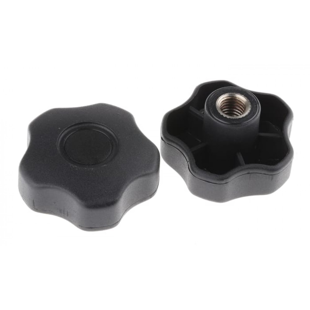 These multiple lobed handwheels from RS PRO are an ergonomic shape to ensure user comfort, with a varying number of lobes depending on the grip and pressure required. The knob handles are made from impact-resistant thermoplastic bodies and male knobs are fitted with a protruding screw insert (male) of either stainless steel or zinc-plated steel. Female knobs and threaded though knobs have threaded inserts of zinc-plated or stainless steel. Zinc-plated steel and stainless steel both provide wear resistance for the threads to ensure that the threads last throughout general use and are not easily damaged or sheared.