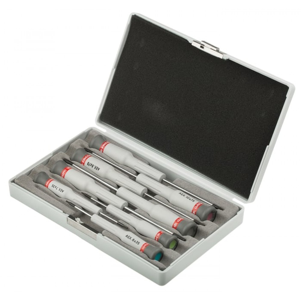 Case set of 8 Facom Micro-Tech Screwdrivers Introducing the 8-pieces set of Micro-Tech Precision Screwdrivers for Facom. These professional tools have been manufactured from high-quality materials for superior durability and high performance. Screwdrivers feature specially designed rotating cap to optimise the turning motion and provide effective pressure in any screwdriver position. This set of professional Micro-Tech screwdrivers is an ideal addition for workstations and maintenance toolboxes and has been designed for use within precision engineer, micro electrics and electronic applications.