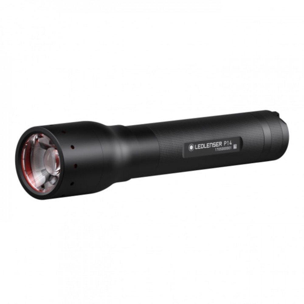 P14 Tactical Focusing LED Torch The Ledlenser P14 features energy efficient CREE® LED, with a beam distance up to 270 metres and a maximum 350 lumens brightness. The housing of this LED torch is made of aircraft grade aluminium and a matt black anodised finish, which looks great and improves grip. The patented Advanced Focus System of this hand torch delivers a more homogenous illuminated field of view and better overall light distribution, both in flood beam and spot beam illumination settings. A dynamic operating switch at one end of the P14 allows the user to regulate brightness with any of the three light settings: power, low power and boost, the size of the switch makes it easy to use, even when wearing gloves. The sliding Speed Focus™ of this LED torch allows the user to zoom from spot beam to flood beam and back with the use of just one hand. The hand torch is powered by 4 x AA batteries included. The P14 is supplied with belt pouch and hand cord. This LED torch is ideal for use in emergency services, search and rescue teams, police squads and security personnel.