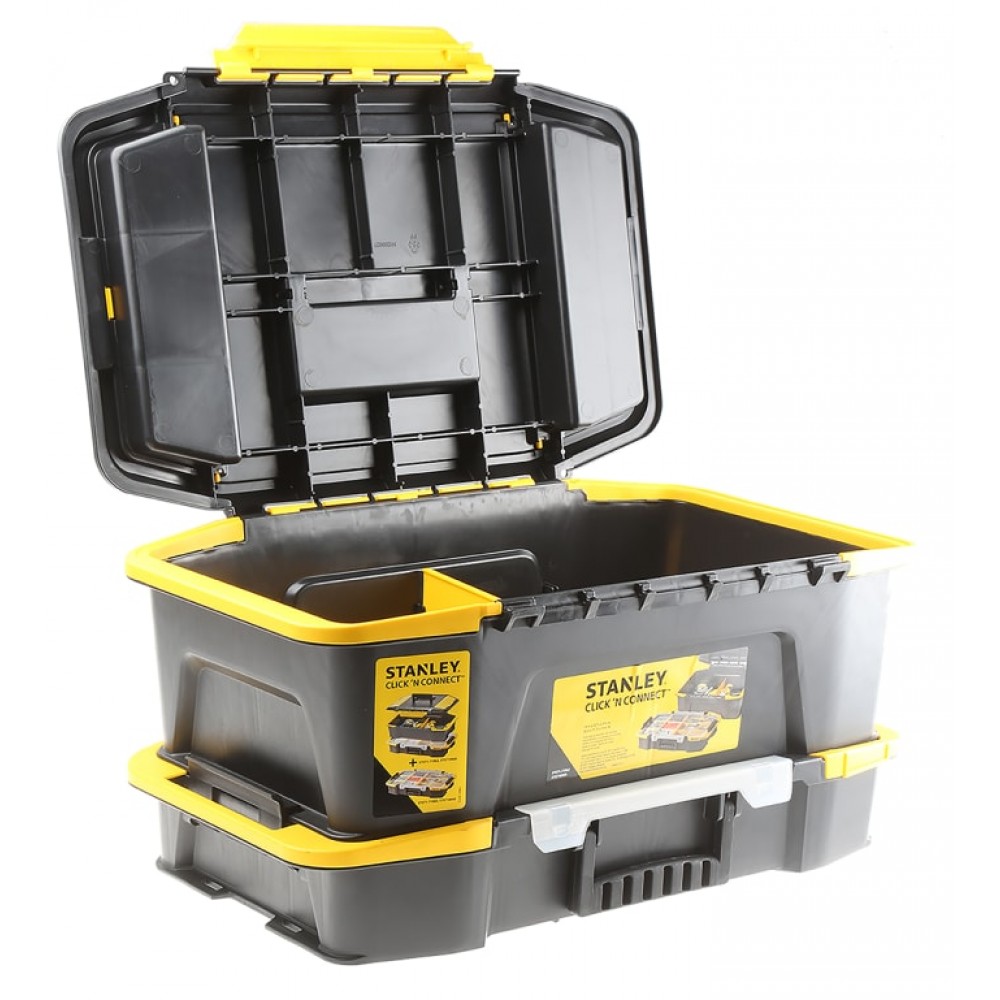 Stanley Click & Connect Tool Boxes & Organisers Introducing the high-quality Stanley Click & Connect Compartment Boxes system featuring a tool organiser designed to click multiple modules together securely enabling the user to carry the stack as one unit. This versatile system is extremely useful when carrying a different kind of equipment. Power Tools and larger items can be easily stored in a deep box while all accessories and smaller part can be organised within the smaller compartment boxes. These boxes are excellent for use in workshops or vans with limited storage space.