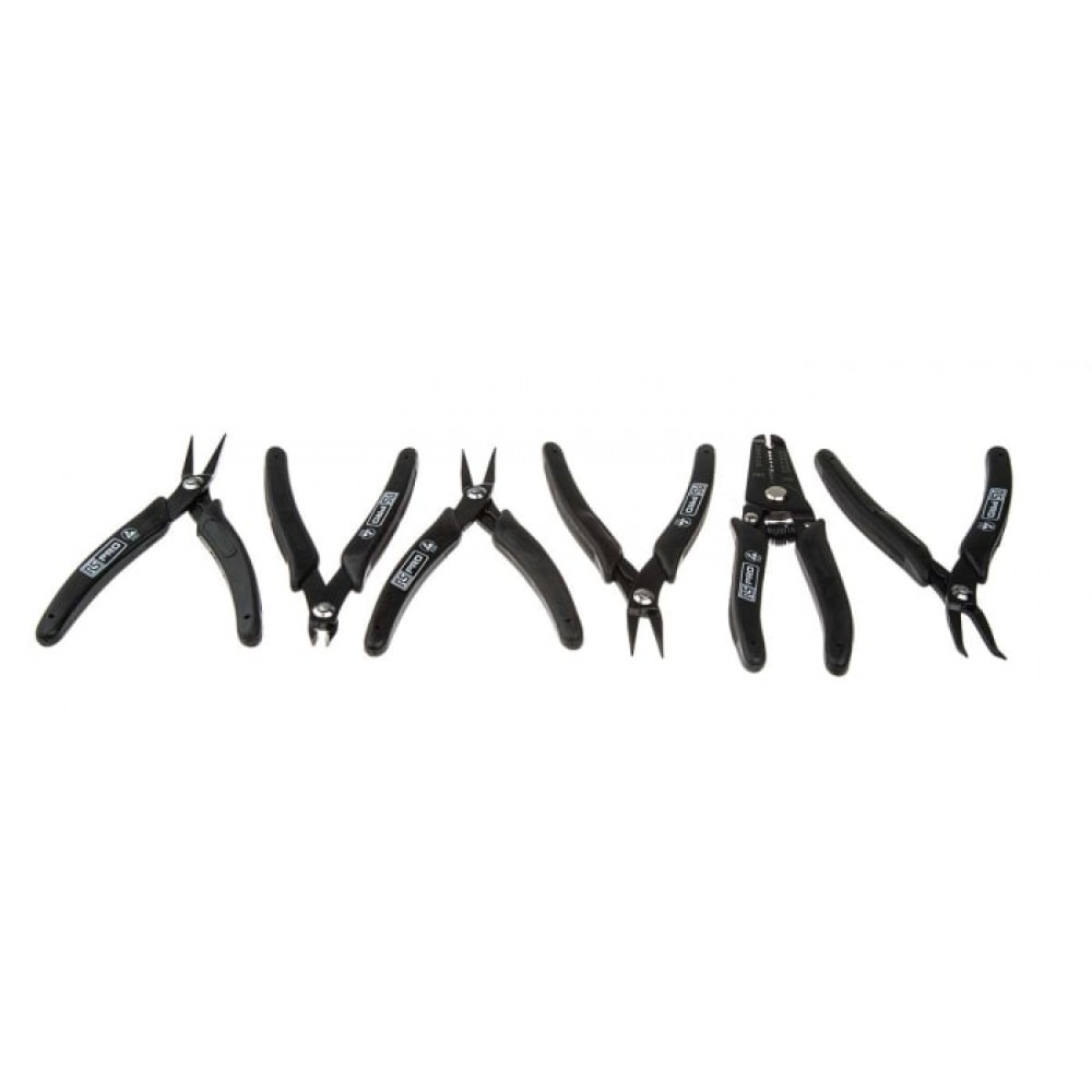 RS PRO 6 Piece ESD Mini Steel Plier Set This exceptional plier set from RS PRO consists of six ESD high-quality pieces made from High Carbon Steel with a Black finish. The mini plier and cutters set are great for those users who require a quality set from professionals (Electricians) to general DIY'er as they are essential tools to have handy. The set is kept within a pouch designed for easy transportation and organisation.