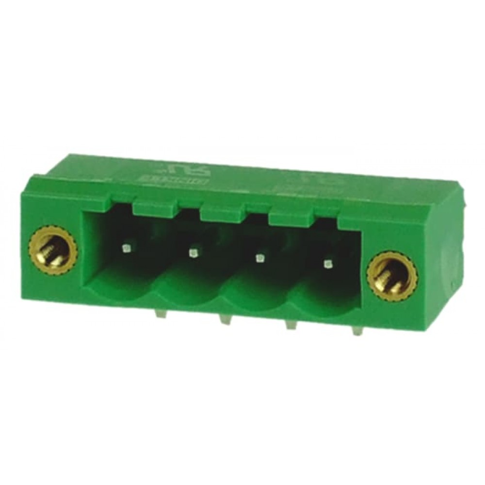 RS 5.0mm Right Angle Mount PCB Terminal Block Headers with Screw Flange Right angle mount PCB terminal block headers with a 5.0mm pitch and screw flanges. These 5.0mm pluggable terminal block PCB header connectors have a 300V 15 A rating and green PA66 housings