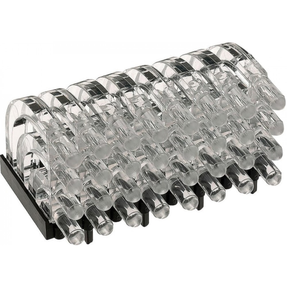 Horizontal Light Guides, 4 Row - Round This family of horizontal light guides, from MENTOR, consist of four rows of light pipes. The round heads are available in 2 mm or 3 mm diameters and are parallel to the printed board on the front panel. This range of quad-level light guides is available in single column or multiple column arrays with up to 40 heads. These light guides use a light diffusing screen to prevent radiation when using a combination of different colours.