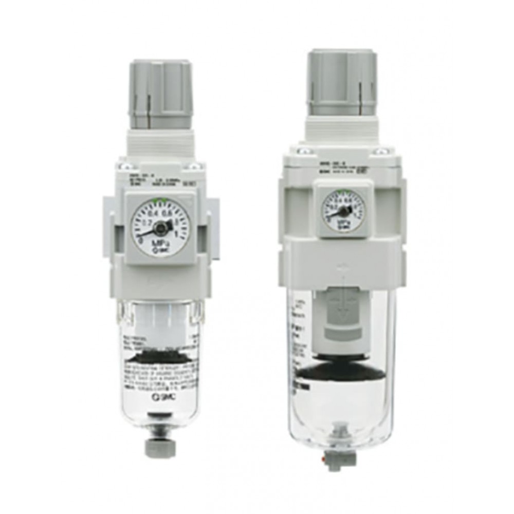 Modular Filter Regulator AW10-B - AW40-B SMCs AW-B series of compact filter regulators combine a filter and regulator into one unit saving on space a piping. Part of SMCs modular air prep range the AW-B can be combined with other components such as a lubricator, soft start valve and mist separators of similar body size to meet the requirements of most air preparation systems. These filter regulators are available in a selection of body sizes from 10 to 40 with piping from G1/8 to G1/2 (also available as M5x0.8). Various options are available including normally open or normally closed autodrain function, round or square pressure gauges and panel mounting kits.