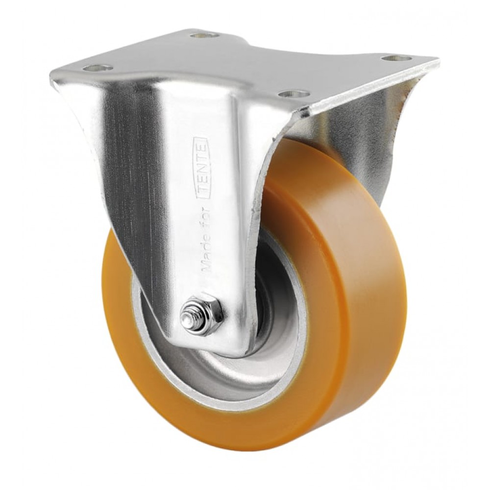 Tente Heavy Duty Plate Castor, Polyurethane Tyre These heavy-duty castors from Tente are made from heavy sheet steel, with a broad reinforced fork and two ball races. The wheel has an aluminium body and precision ball bearing, and is made from polyurethane for durability.