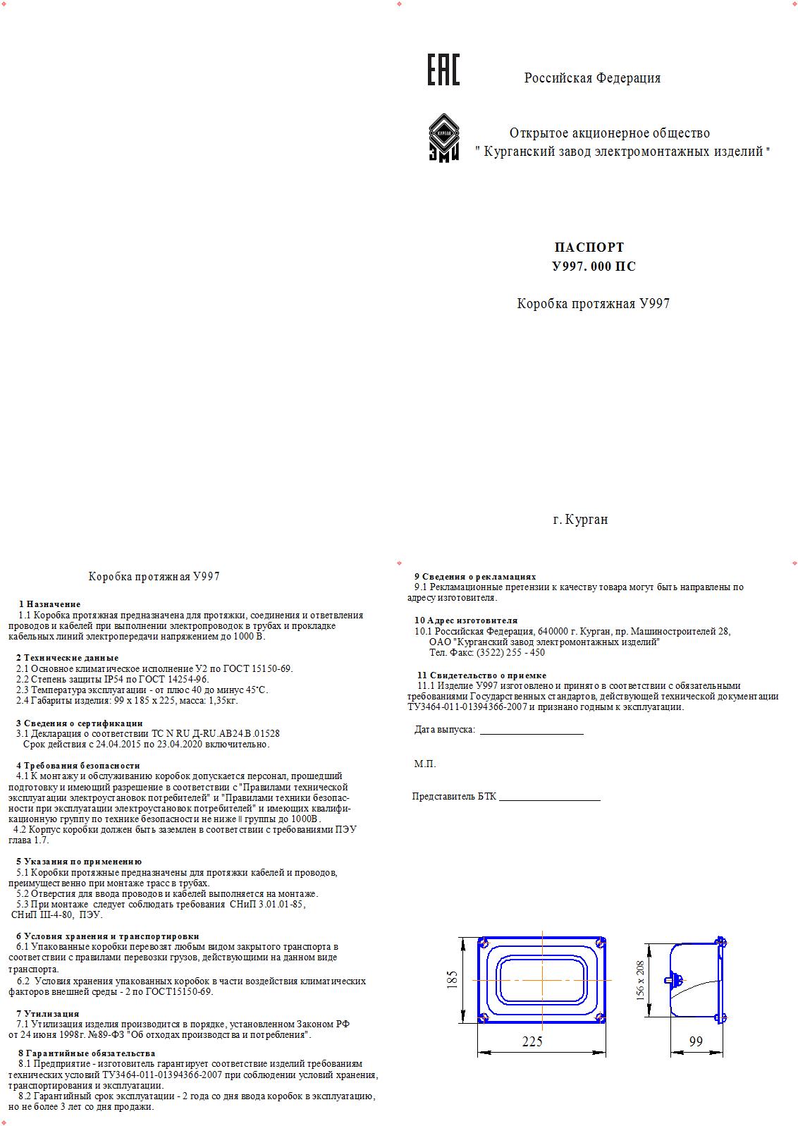 Описание Коробка протяжная У997 У2, окрашенная, IP54 П0000000972