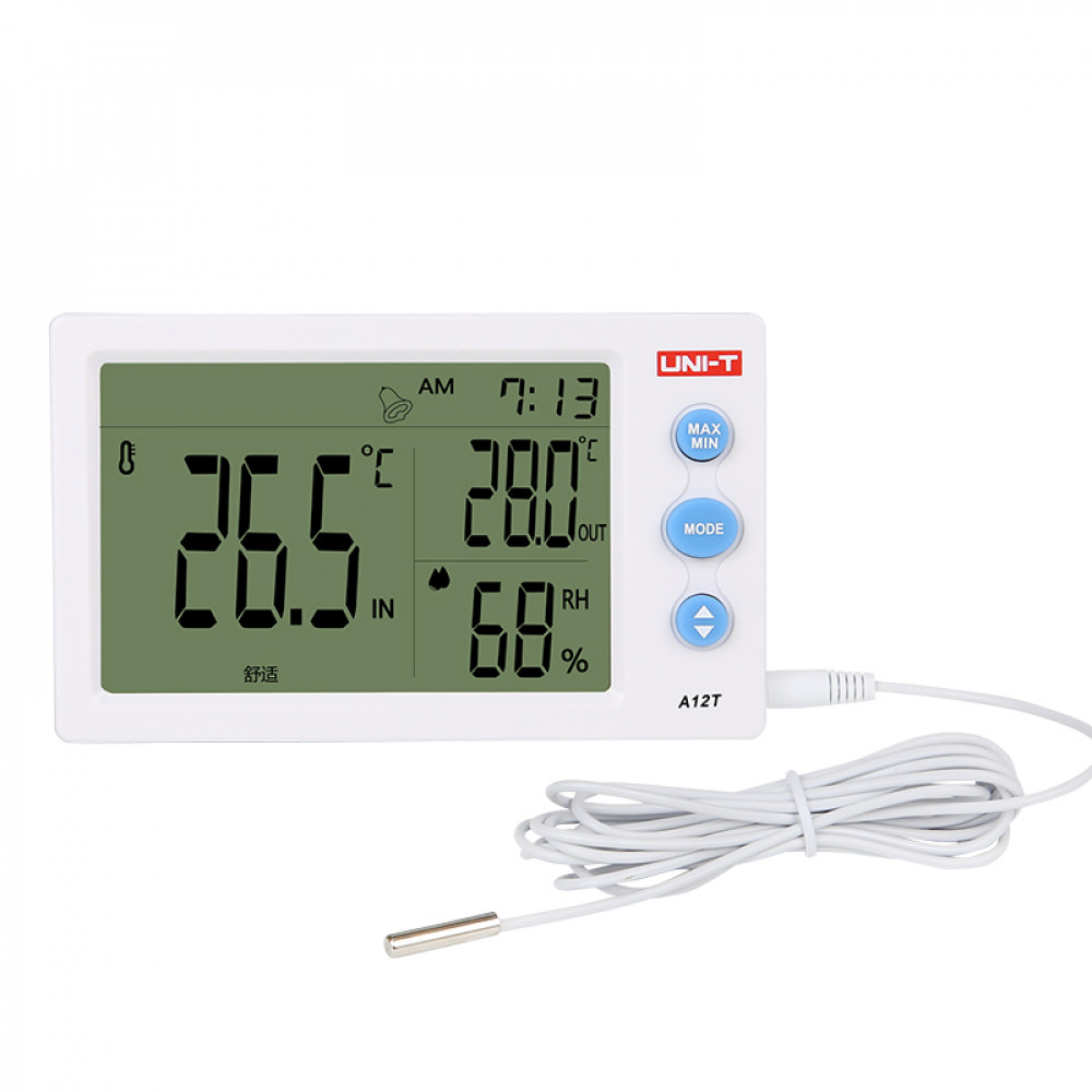 A12T, Цифровой измеритель температуры и влажности с внешним датчиком. Прибор оснащен будильником и 12/24-часовым режимом отображения времени. Предусмотрено отверстие для подвешивания и штатив для настенного или настольного крепления