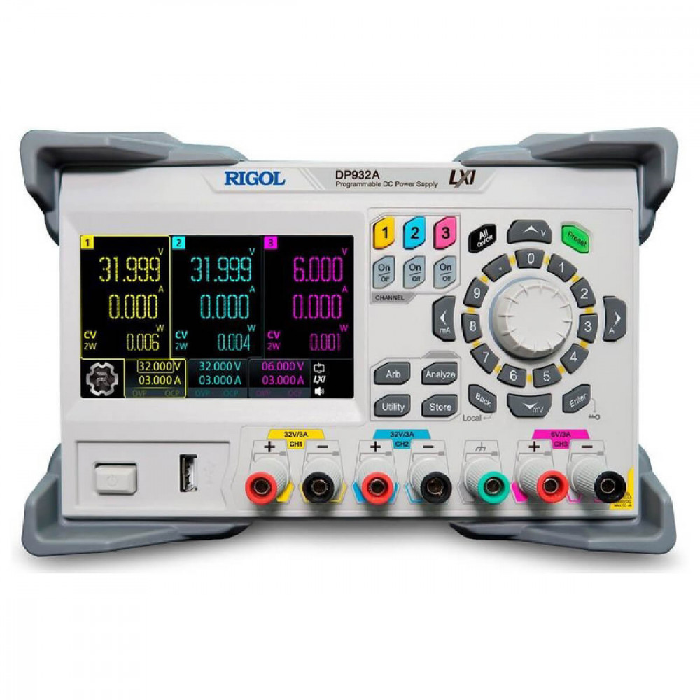 DP932A, Программируемый линейный источник питания постоянного тока, 3 изолированных канала (1-32В/3А, 2-32В/3А, 3-6В/3А), 210 Вт, пульсации <350 мкВскз, разрешение 1мВ/1мА, цветной сенсорный 4,3" ЖК-дисплей, USB, LAN, Digital I/O