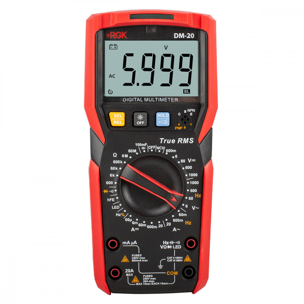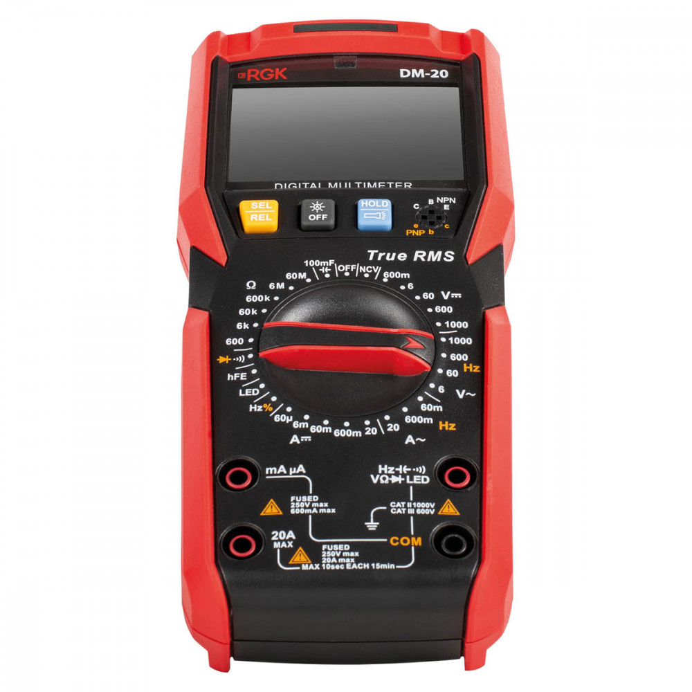 Цифровой мультиметр RGK DM-20 - это надежный и безопасный прибор для измерения целого ряда параметров электросетей и оборудования, прозвонки цепей, тестирования различных компонентов электроприборов. Благодаря широкому арсеналу функций и измерительных режимов эта портативная модель может использоваться как в быту, так и в таких профессиональных отраслях, как строительство, сервисное обслуживание и др.