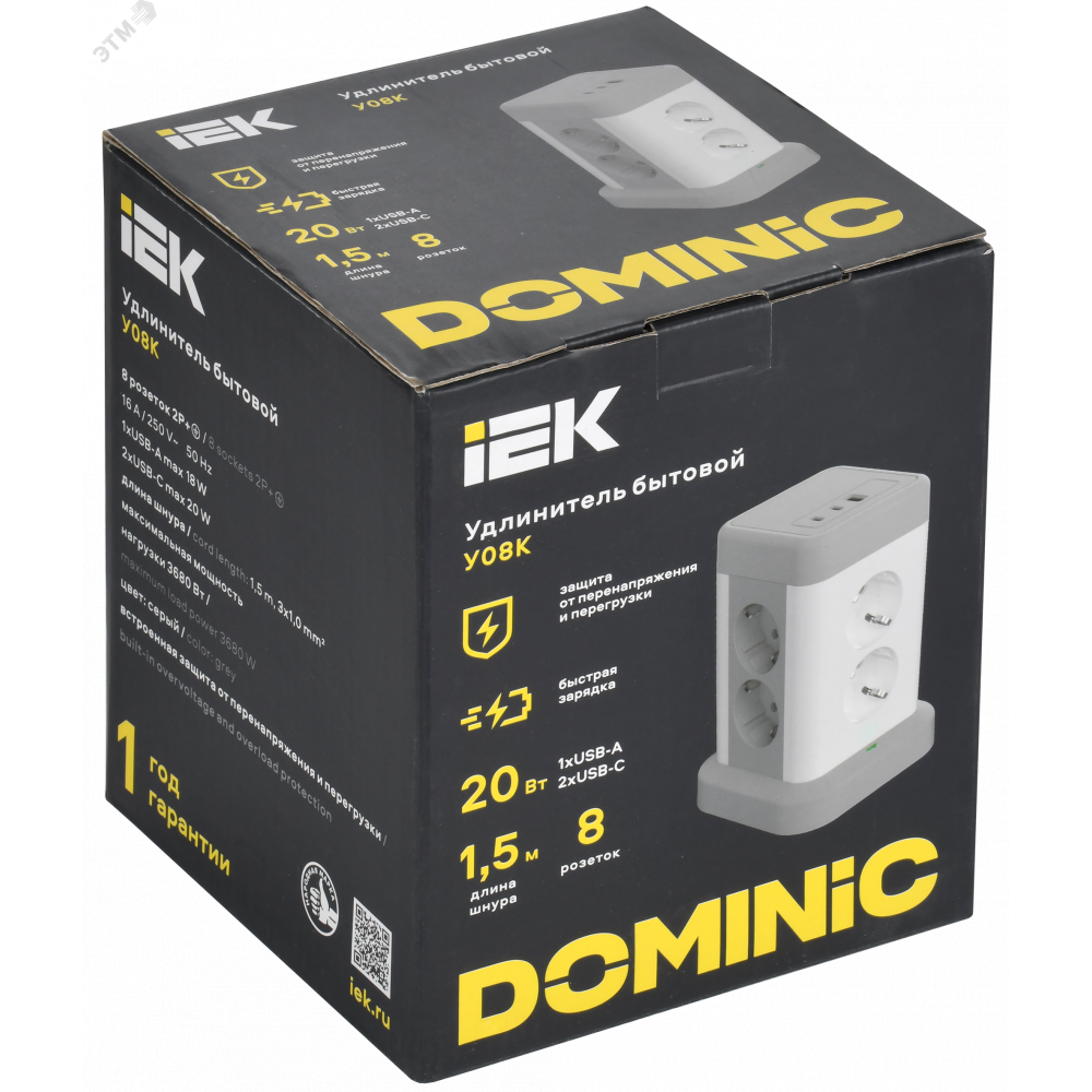 Доставка DOMINIC Удлинитель У08K 8 мест 2P+PE 1,5м 3х1,0мм2 16А/250В USB A+C 20Вт серый IEK DN-YP30-16-08-01-ZKU-K41