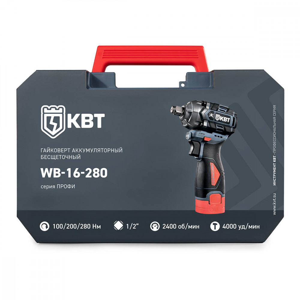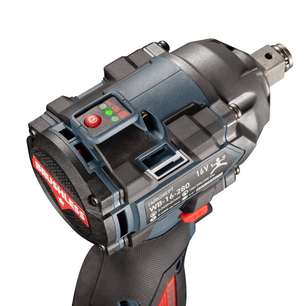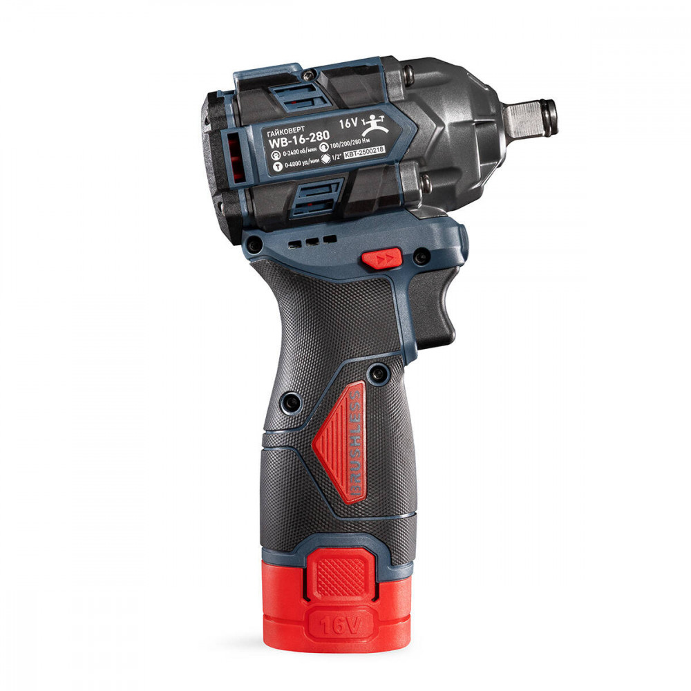 Гайковерт WB-16-280 серия ПРОФИ, Гайковерт ударный аккумуляторный 16V бесщеточный с максимальным крутящим моментом 280 Нм, 2 аккумуляторные батареи: Li-ion, 16 В/2Ач, з/у, патрон квадрат 1/2"
