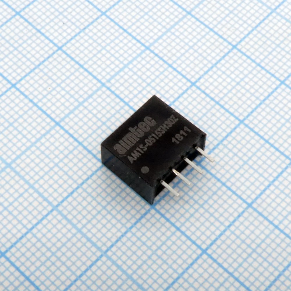 AM1S-0515SH30Z, DC/DC, 1Вт, вход 4.5…5.5В, выход 15В/0.067А, изоляция 3000В DC, КПД 82%, максимальная емкостная нагрузка не более 220мкФ, SIP4, 11.68x6x9.7мм, -40…85°C, пластик