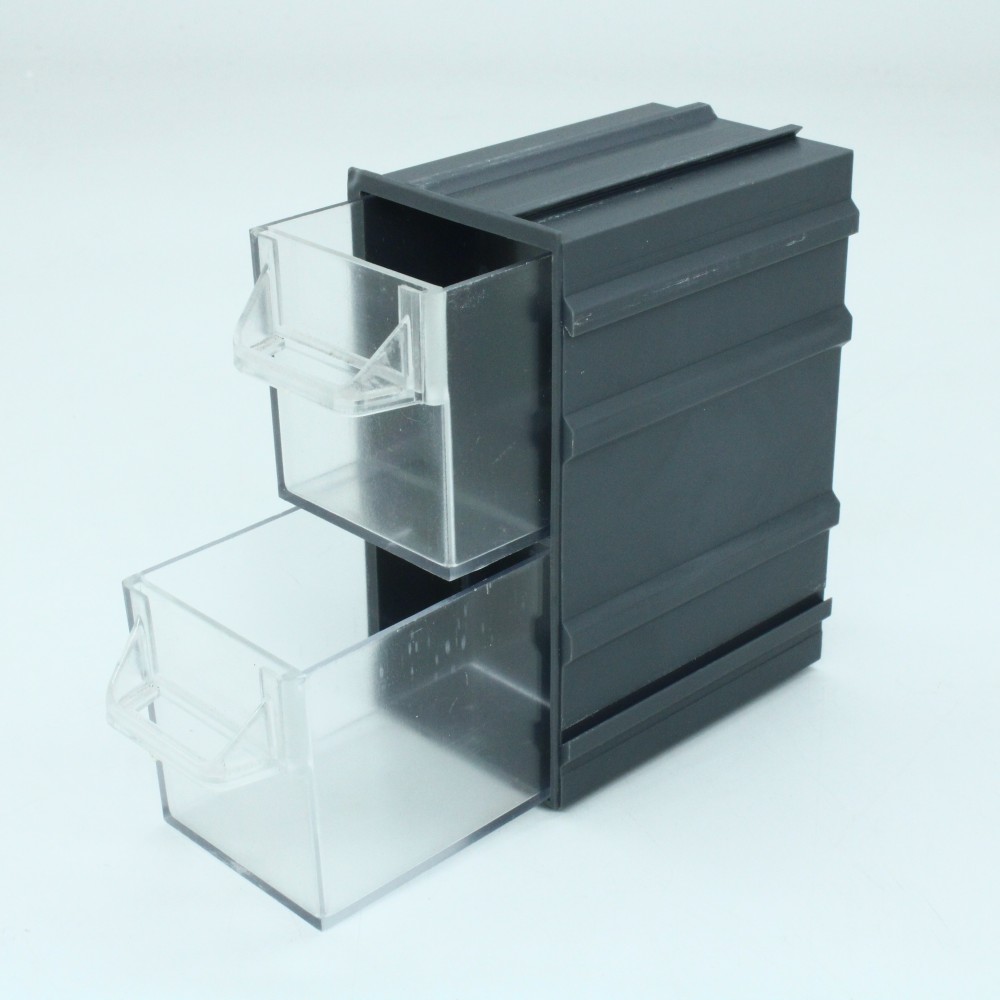 Состоит из 2х выдвижных лотков, объединённых одним корпусом. На задней части корпуса расположены крепёжные отверстия, с помощью которых контейнер можно легко прикрепить к стене. В ручках лотков предусмотрен отсек для бирки, на которых можно перечислить ассортимент хранимого в данном контейнере. Контейнеры собираются между собой с помощью ласточкина хвоста. Таким образом, из них можно собрать стойку любого размера. Стыкуется с контейнерами К4, К5, К6, К7.