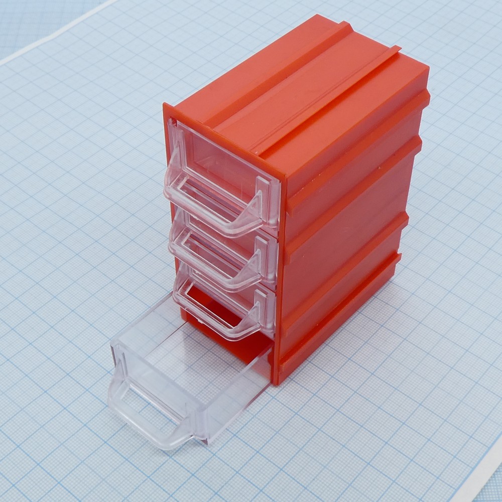 Состоит из 4х выдвижных лотков, объединённых одним корпусом. На задней части корпуса расположены крепёжные отверстия, с помощью которых контейнер можно легко прикрепить к стене. В ручках лотков предусмотрен отсек для бирки, на которых можно перечислить ассортимент хранимого в данном контейнере. Контейнеры собираются между собой с помощью ласточкина хвоста. Таким образом, из них можно собрать стойку любого размера. Стыкуется с контейнерами К3, К4, К6, К7.