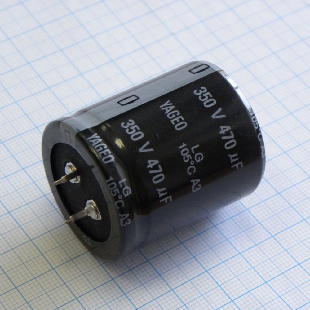 Конденсатор алюминиевый электролитический 470мкФ 350В ±20% (35 X 40мм) защелкиваемые выводы 10мм 1300мА 2000час 105°C россыпь