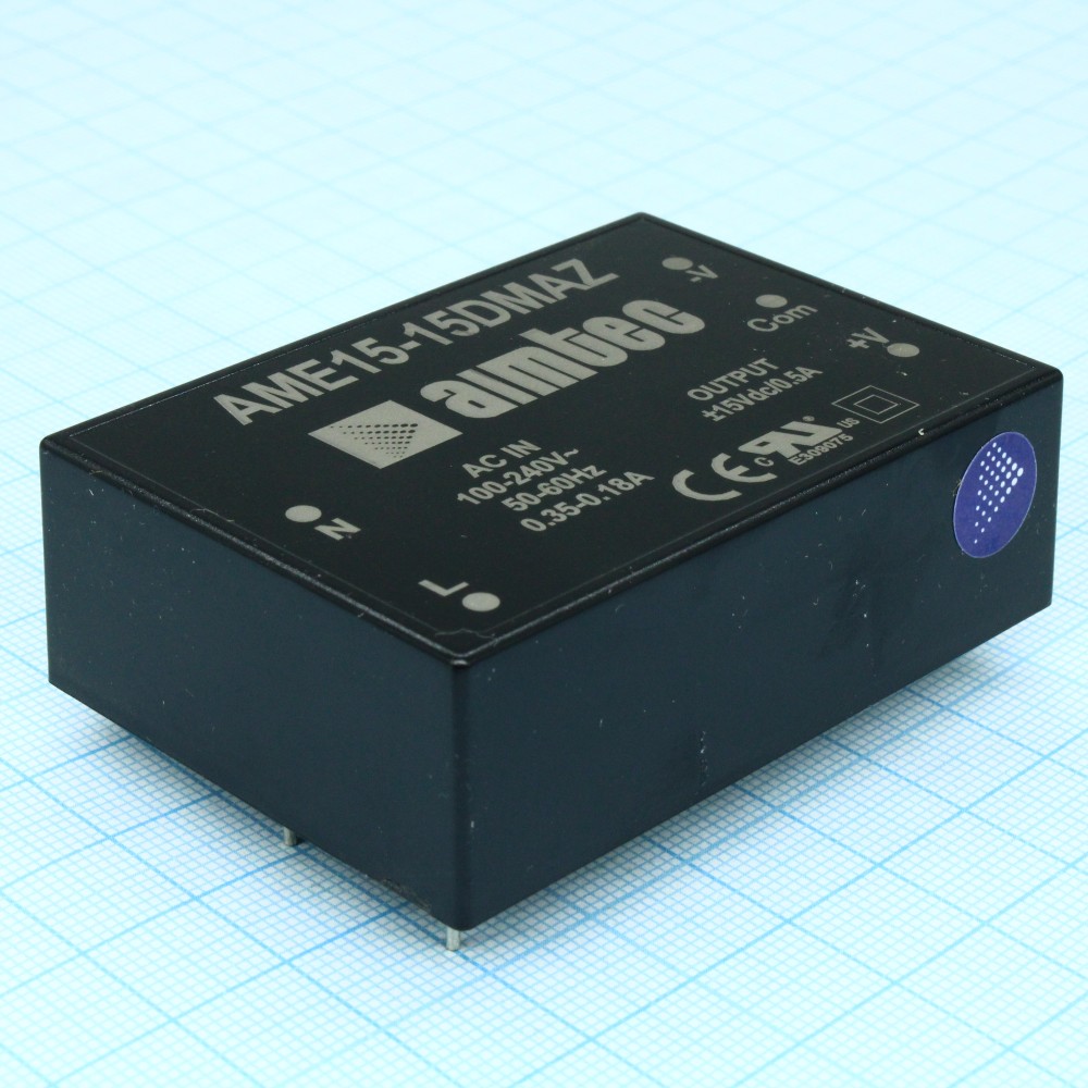 AME15-15DMAZ, AC-DC, 15Вт, два выхода ±15В/±0.5А, вход 90…264V AC, 47…440Гц / 130...370V DC, изоляция 4000V AC, в корпусе на плату 65х46.5х21мм, -40…+85°С