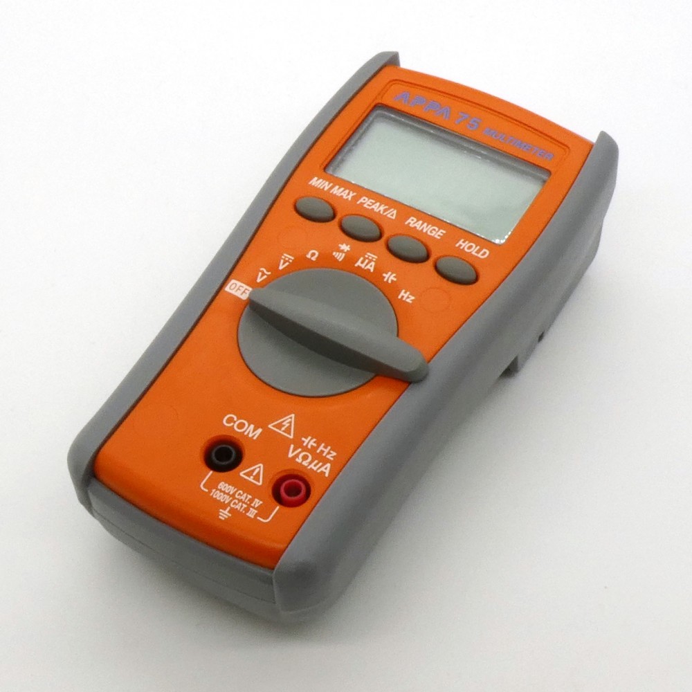 APPA 75, Мультиметр, U пост. 0,4...1000В (погрешность ± 0,5 % (базовая)), U пер. 0,4...750В (50Гц-500Гц), I пост 0,1…400мкА, R 0,1Ом...40МОм (разрешение 0,1 Ом), емкость 4нФ...40мФ (1пФ), прозвон цепи (до 30 Ом)