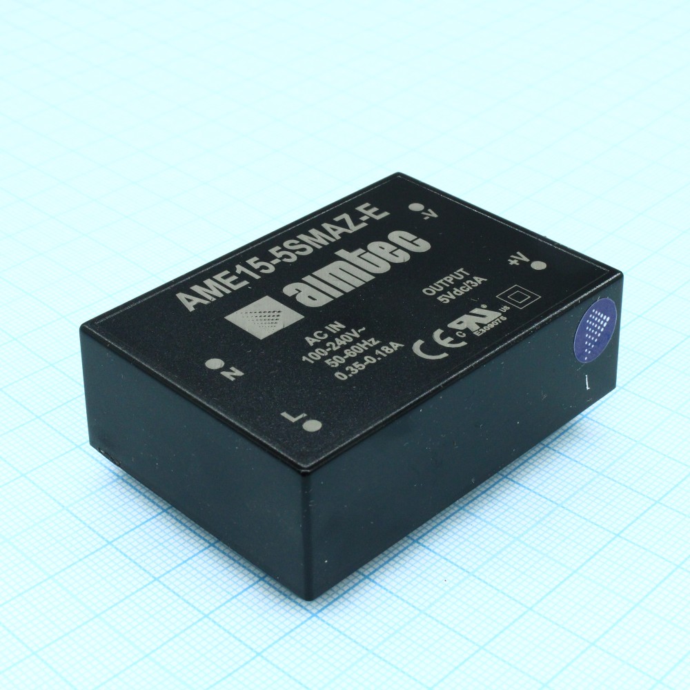 AME15-5SMAZ, AC/DC, 15Вт, вход 90…264В, выход 5В/3А, изоляция 4000В AC, КПД 77%, максимальная емкостная нагрузка не более 2200мкФ, 65x46.5x20.1мм, -40…85°C, пластик