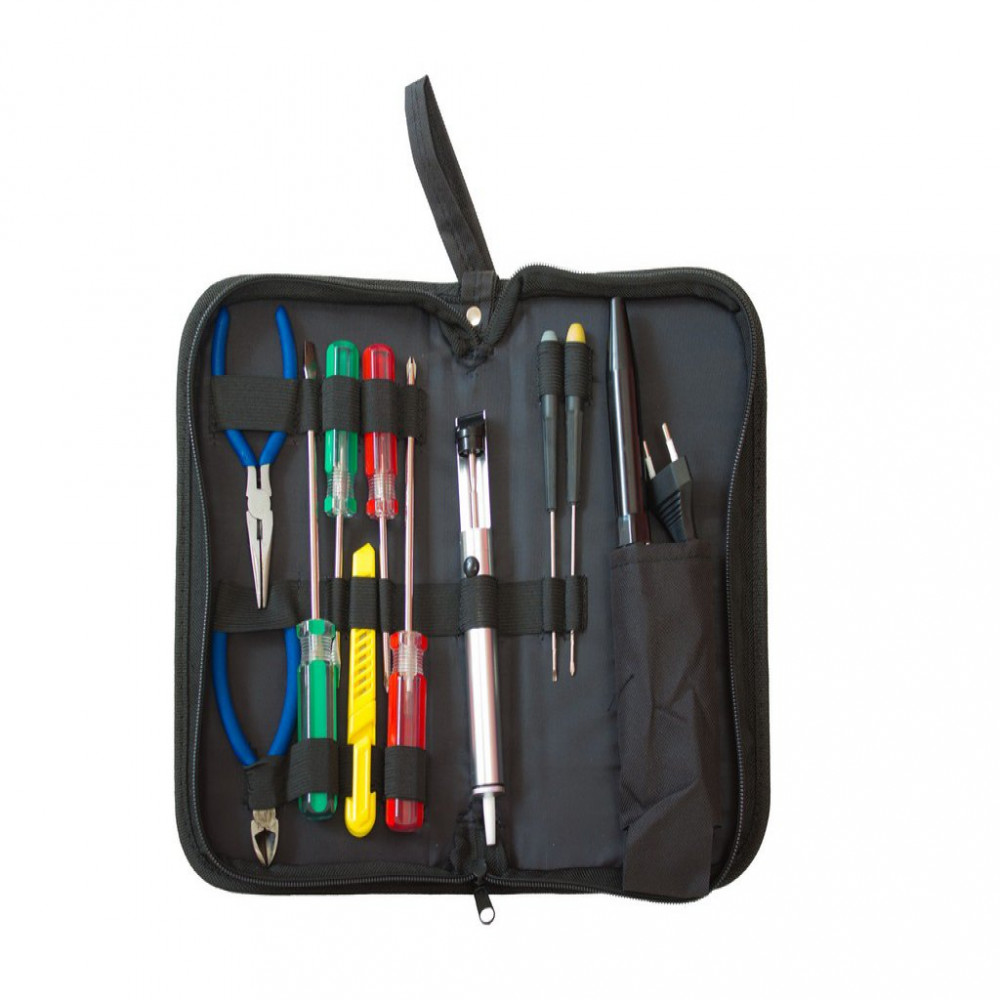 Паяльник,оловоотсос, отвертки(+0*75,+1*75,+2*125,-2.5*75,-5*75,-6*125),длинногубцы 130мм,бокорезы 120мм, нож.