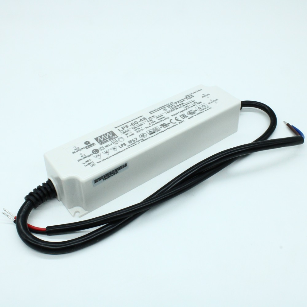 LPF-60-48, AC/DC LED CV+CC, 60Вт, вход 90…305В AC, 47…63Гц /127…431В DC, выход 28.8…48В/1.25A, ККМ, изоляция 3750В AC, в кожухе 162.5х43х32мм, -40…+80°С, IP67