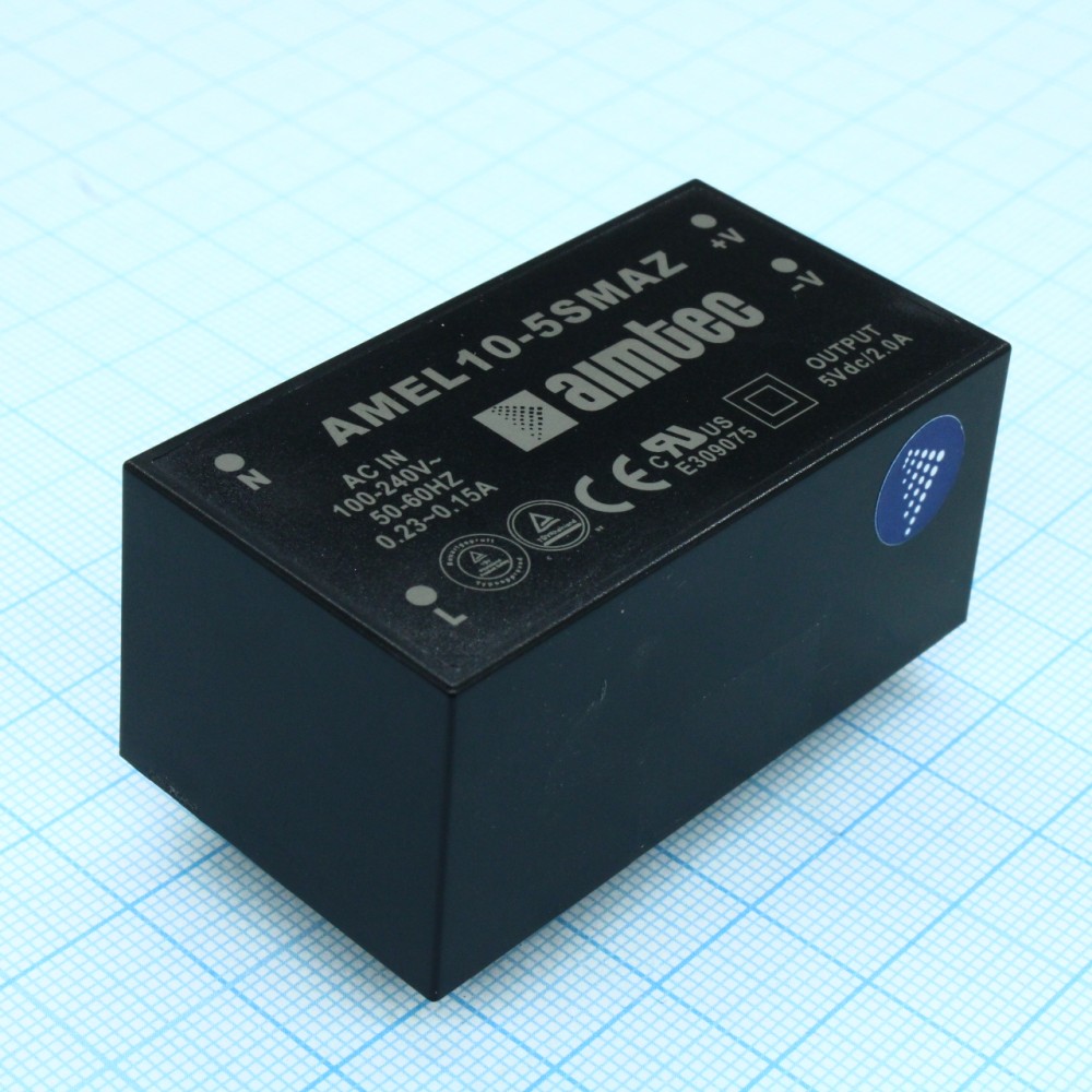 AMEL10-5SMAZ, AC/DC, 10Вт, вход 90…264В, выход 5В/2А, изоляция 4000В AC, КПД 75%, максимальная емкостная нагрузка не более 1000мкФ, 56.48x30.86x25.1мм, -40…70°C, пластик