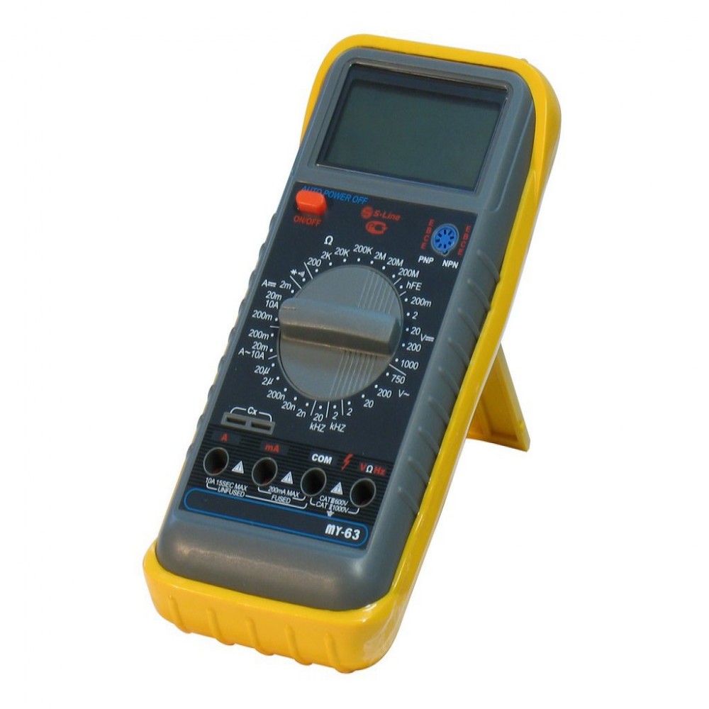 MY-63, Мультиметр цифровой с большим входным сопротивлением, имеет дополнительные функции: измерение тока, напряжения, сопротивления, частоты и емкости, тест диодов и транзисторов, прозвон цепей.
