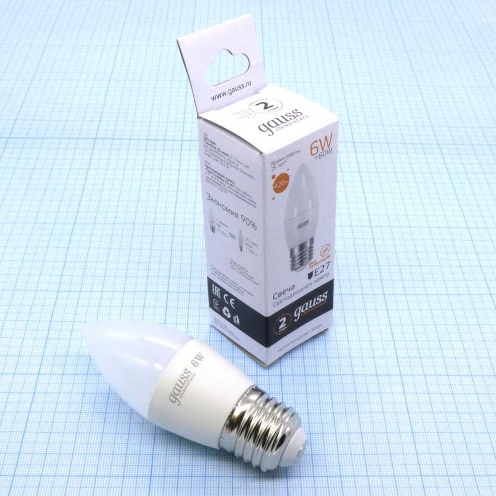 Лампа LED Gauss 6W тёпл свеча (86), E27,3000k,100*37,420Lm