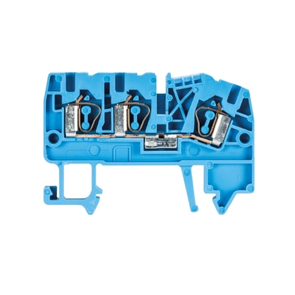 Проходная клемма, 3 точки подключения, тип фиксации провода: пружинный, номинальное сечение: 2,5 мм кв., 24А, 800V, ширина: 5 мм, цвет: синий, тип монтажа: DIN35