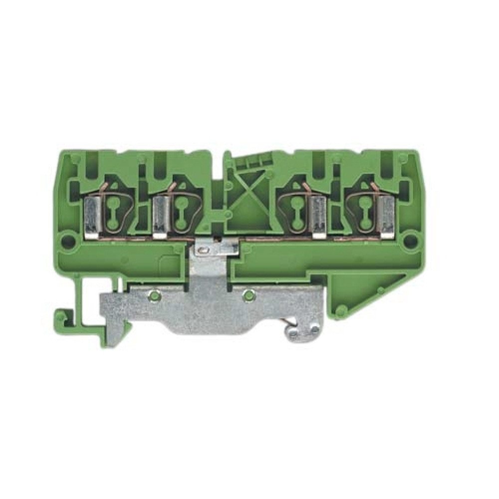 Заземляющая клемма, 4 точки подключения, тип фиксации провода: пружинный, номинальное сечение: 2,5 мм кв., 800V, ширина: 5 мм, цвет: желто-зеленый, тип монтажа: DIN35