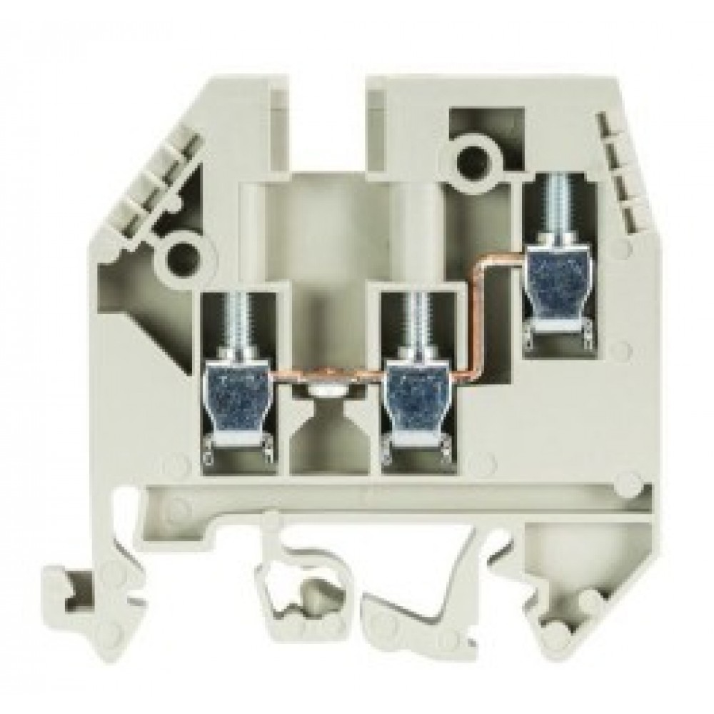 Проходная клемма, 3 точки подключения, тип фиксации провода: винтовой, номинальное сечение: 4 мм кв., 32A, 800V, ширина: 6,2 мм, цвет: серый, тип монтажа: DIN35, винтовая перемычка, зажимная клетка: латунь