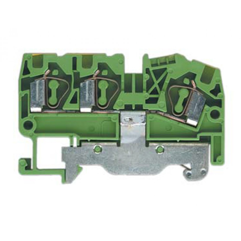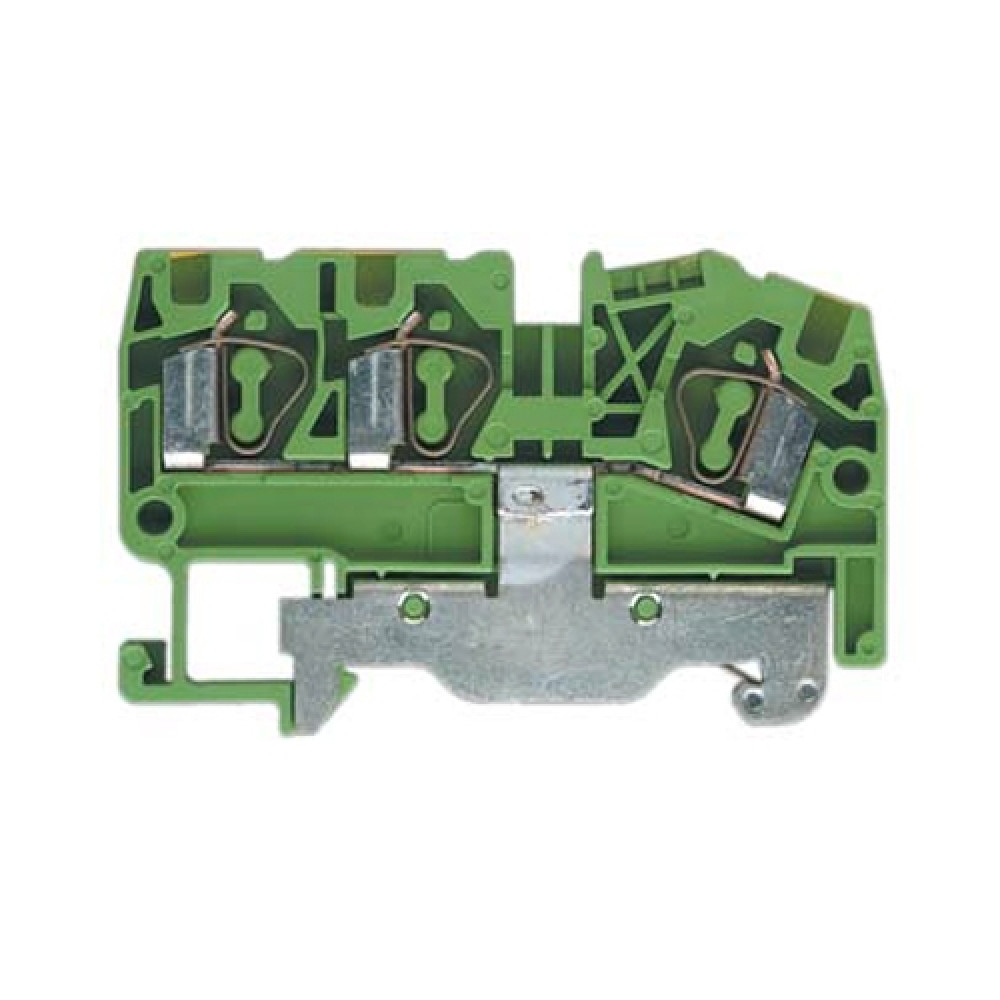 Заземляющая клемма, 3 точки подключения, тип фиксации провода: пружинный, номинальное сечение: 4 мм кв., 32A, 800V, ширина: 6 мм, цвет: желто-зеленый, тип монтажа: DIN35