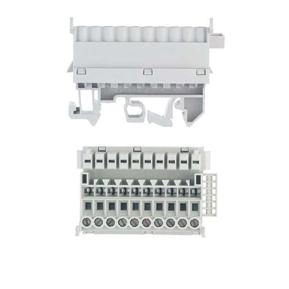 Вилка на DIN рейку, 10 полюсов, тип фиксации провода: винтовой, номинальное сечение: 2,5 мм кв., 10A, 400V, ширина: 38 мм, цвет: серый, тип монтажа: DIN35