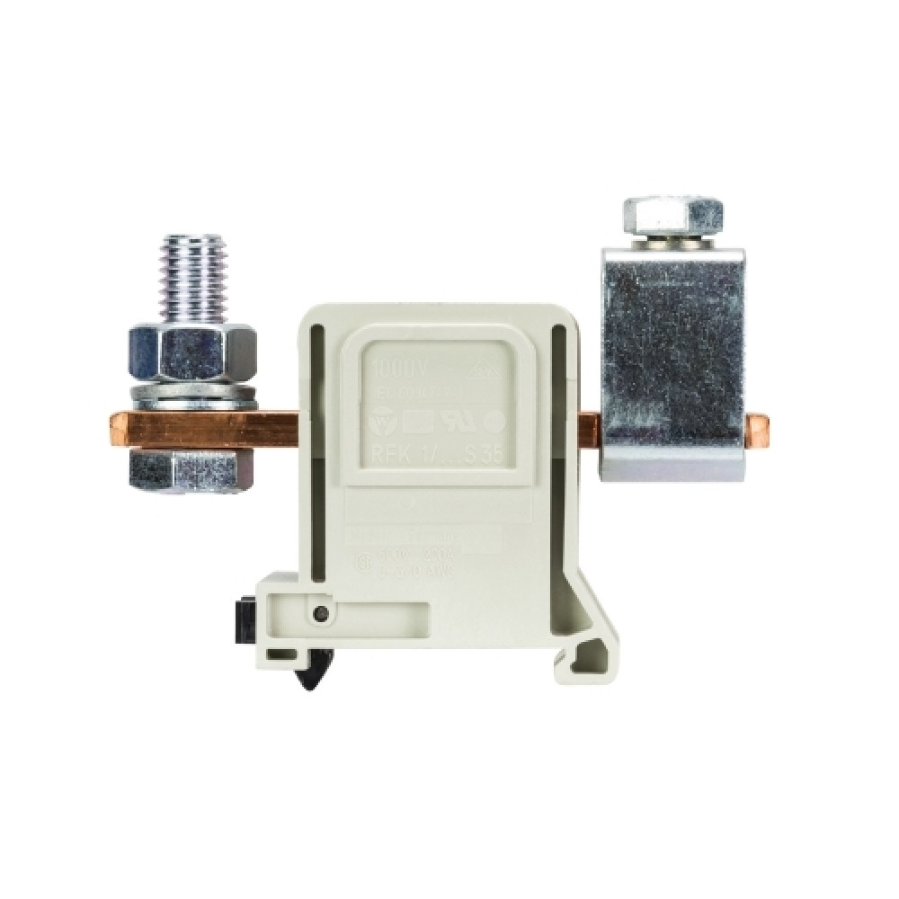 Доставка Болтовая клемма RFK 1/95 FMK S35 , Болтовая клемма, М10, схема: зажим - перевернутый болт, тип фиксации провода: зажим-болт, номинальное сечение: 95 мм кв., 250A, 1000V, ширина: 32 мм, цвет: серый, тип монтажа: DIN35