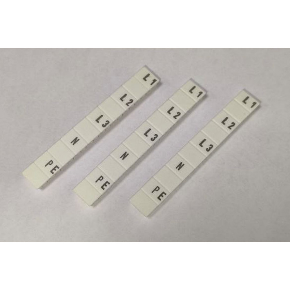 Маркировочные шильдики, для клемм сечением 4 мм.кв., боковая / верхняя, 10 шильдиков, нанесенные символы: L1, пробел,L2, ,L3, ,N, ,PE с горизонтальным расположением, размер шильдика: 5,75 x 8,3 мм, цвет: белый
