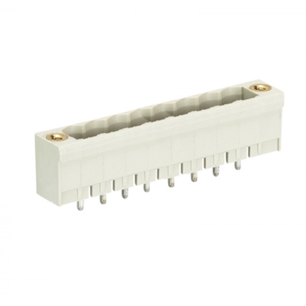 Вилочный разъем на плату 8213 S/8 GF M OB, Вилочный разъем, вертикальный, на плату, шаг: 5.08 мм, 7 полюсов, фиксация на плате пайкой, исполнение: без маркировки, с монтажными фланцами, 300V, 10А, цвет: серый