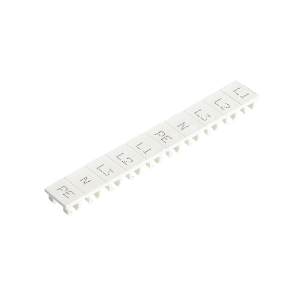 Маркировочные шильдики, для клемм сечением 2,5 мм.кв., боковая / верхняя, 10 шильдиков, нанесенные символы: L1.L2.L3.N.PE, с горизонтальным расположением, размер шильдика: 4,8 x 8,3 мм, цвет: белый