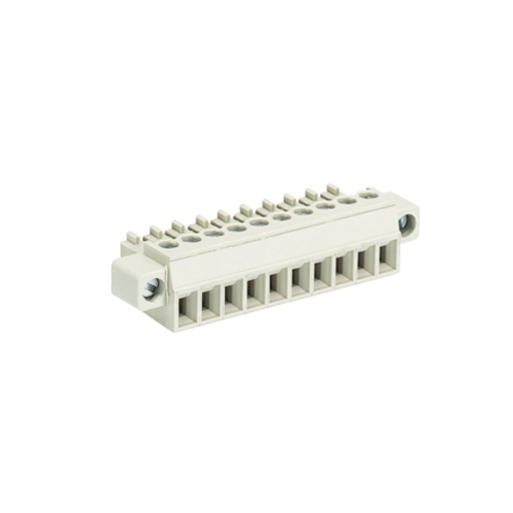 Розеточный разъем на кабель 8513 B/10 F OB, Розеточный разъем, угловой, на кабель, шаг: 3.5 мм, 10 полюсов, фиксация провода винтовая, исполнение: без маркировки, с монтажными фланцами, 250V, 8А, цвет: серый