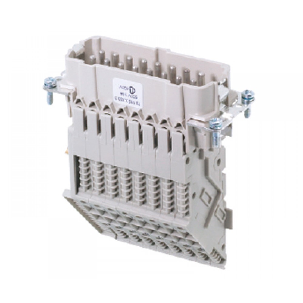 Вилочная контактная вставка, пружинная фиксация, 16 полюсов + PE, типоразмер 16B, 500V, 16A, сечение обслуживаемых проводников 0,5-2,5 мм кв, тип покрытия контактов: серебро, заземление справа, длинное исполенение, (6 полей для маркировки)