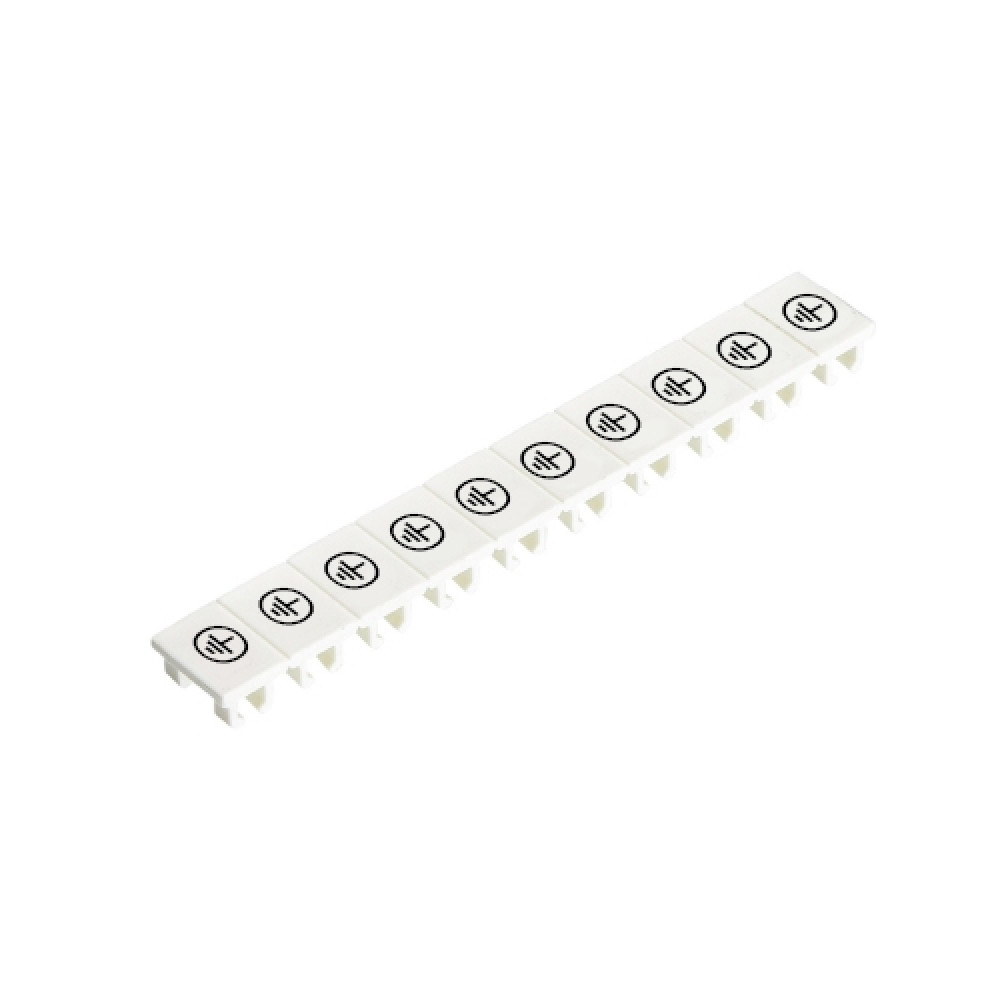 Маркировочные шильдики, для клемм сечением 2,5 мм.кв., боковая / верхняя, 10 шильдиков, нанесенные символы: "земля" в кружечке, с горизонтальным расположением, размер шильдика: 4,8 x 8,3 мм, цвет: белый