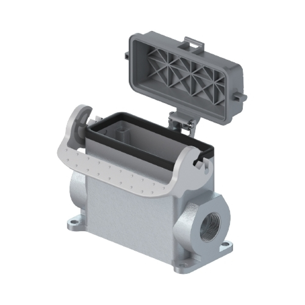 Основание разъема на панель, закрытое, типоразмер 24B, высокое исполнение, с уплотнителем, 1 отверстие с резьбой для кабельных вводов M32x1,5, с одной защелкой, с защитной крышкой, материал корпуса: алюминиевый сплав