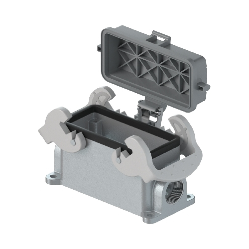 Основание разъема на панель, закрытое, типоразмер 16B, с уплотнителем, 2 отверстия с резьбой для кабельных вводов M25x1,5, без защелок (упоры для двух защелок), с защитной крышкой, материал корпуса: алюминиевый сплав