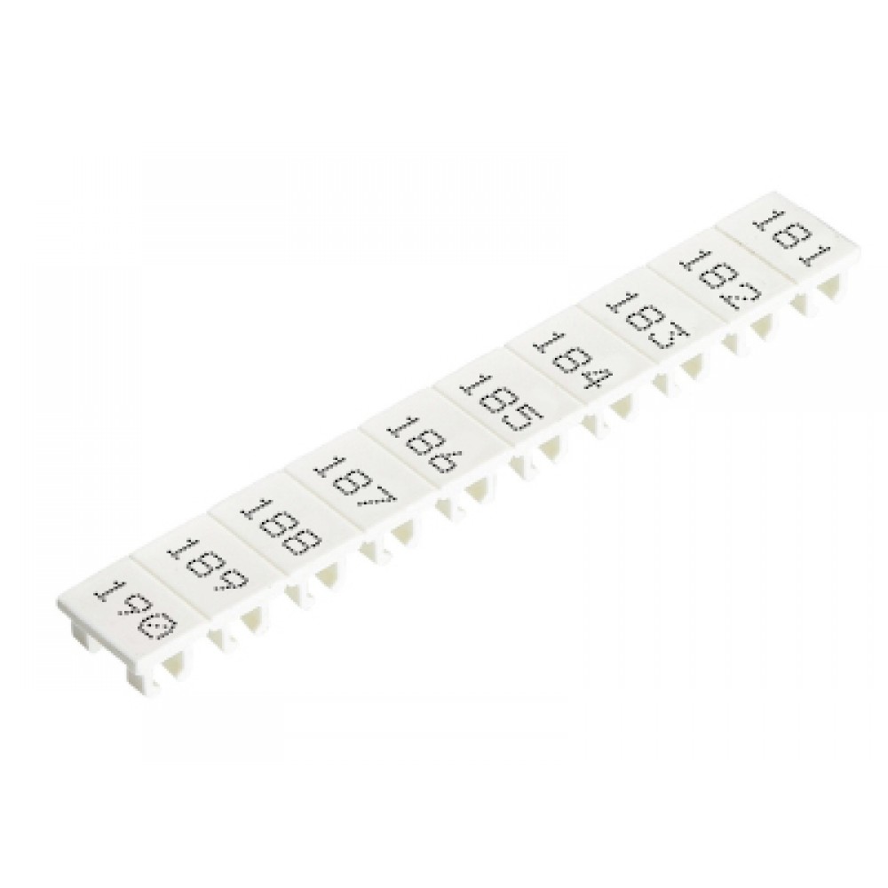 Маркировка для клемм (полоска) 9705A/6/10 B 181-190, Маркировочные шильдики, для клемм сечением 4 мм.кв., боковая / верхняя, 10 шильдиков, нанесенные символы: 181...190, с горизонтальным расположением, размер шильдика: 5,75 x 8,3 мм, цвет: белый
