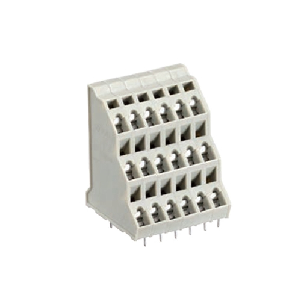 Клемма 8291DFK/6/18 OB, Клемма, 3 этажа, подвод кабеля 45 град., на плату, шаг: 5.08 мм, 18 полюсов, фиксация провода пружинная, исполнение: без маркировки, 250V, 12A, цвет: серый