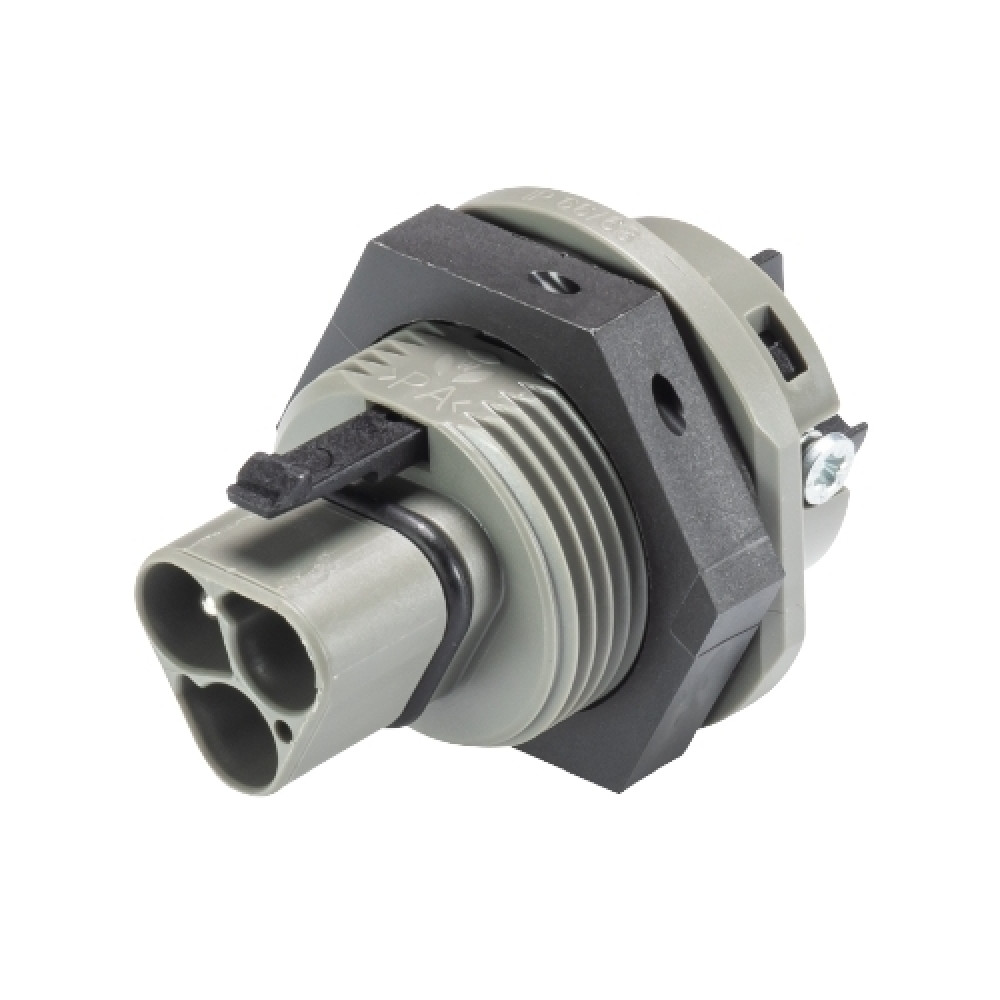 Вилочный разъем в панель RST25I3S S1 M01V BG03, Вилочный разъем в панель, М25, 3 полюса, тип фиксации провода: винтовой, номинальные характеристики: 250V, 25A, цвет корпуса: черный, цвет контактной вставки: серый, серия RST Classic