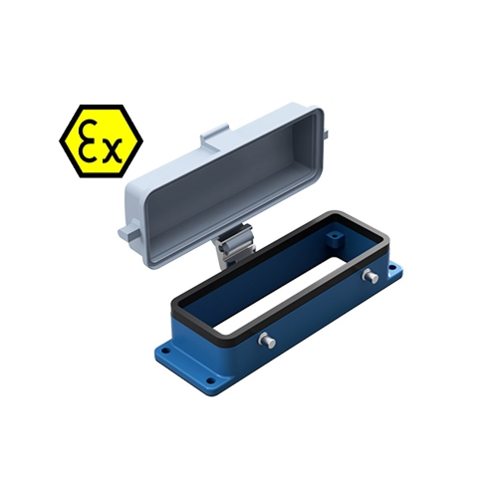 Основание разъема на панель, открытое, типоразмер 24B, взрывозащита, с уплотнителем, без защелок (упоры для двух защелок), с пластиковой защитной крышкой, материал корпуса: цинковый сплав