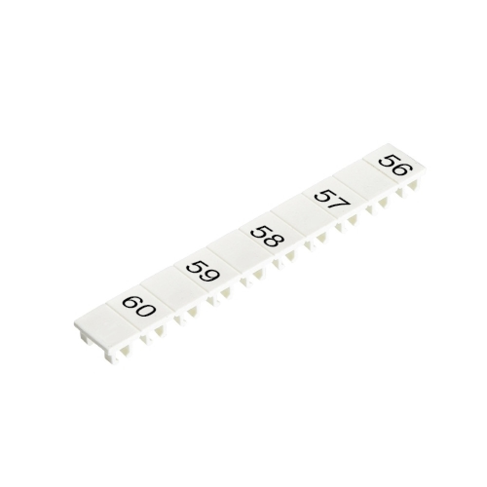 Маркировочные шильдики, для клемм сечением 2,5 мм.кв., боковая / верхняя, 10 шильдиков, нанесенные символы: 56, пробел,57, ,58, ,59, ,60, с горизонтальным расположением, размер шильдика: 4,8 x 8,3 мм, цвет: белый