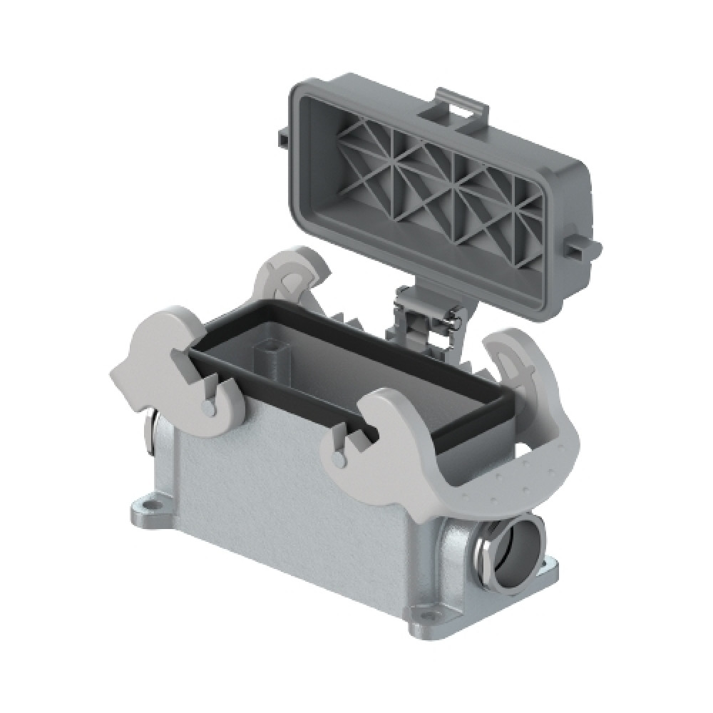 Основание разъема на панель, закрытое, типоразмер 24B, с уплотнителем, 2 кабельных ввода M25x1,5, IP54, без защелок (упоры для двух защелок), с защитной крышкой, материал корпуса: алюминиевый сплав