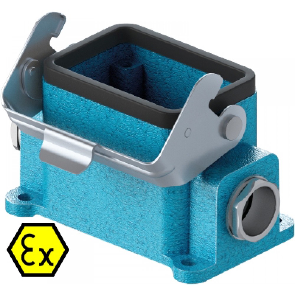 Основание разъема на панель, закрытое, типоразмер 6B, взрывозащита, с уплотнителем, 2 кабельных ввода M20x1,5, IP54, с боковым расположением, с одной защелкой, с пластиковой защитной крышкой, материал корпуса: цинковый сплав
