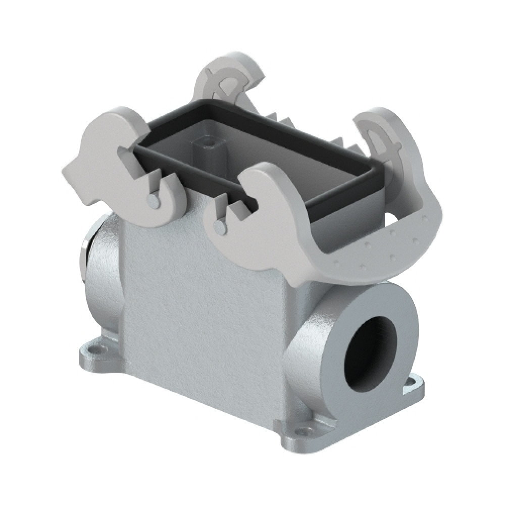 Закрытое основание разъема BAS GUT GC 10HM32 A0, Основание разъема на панель, закрытое, типоразмер 10B, высокое исполнение, с уплотнителем, 1 кабельный ввод M32x1,5, IP54, с левым расположением, с двумя защелками, без защитной крышки, материал корпуса: алюминиевый сплав